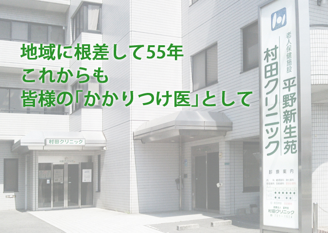 医療法人富寿会「村田クリニック」は、昭和34年10月に開院して以来、平野区を中心に地域に根差した医療を行って参りました。また、昭和62年からは地域で最初の介護老人保健施設「平野新生苑」をオープンさせ、より良い高齢者福祉・医療を目指して努力して参りました。