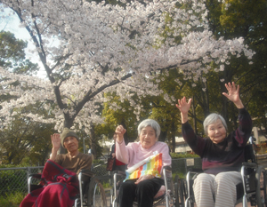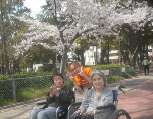 さて、この陽気に誘われて、平野新生苑の入所者の方と職員で、村田クリニックのすぐ南側にある「平野公園」へ花見に行ってきました。